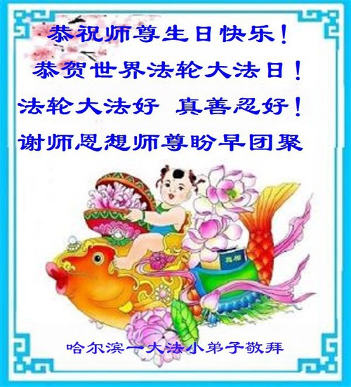 A five-year-old in Harbin, Heilongjiang Province wrote, “My grandma taught me to read Falun Dafa books as soon as I started talking. I can recite many of Master Li’s poems. I can also sing Falun Dafa songs. My grandma also showed me how to do the exercises and send righteous thoughts. I had a high fever of 104 last year but my temperature returned to normal after I recited ‘Falun Dafa is good, Truthfulness-Compassion-Forbearance is good’ nine times in a row. Just a few days ago, I struggled to cough out phlegm. I recited one of Master’s articles 19 times non-stop and the phlegm that was stuck in my throat dissolved on its own. Another time I recited another article of Master Li’s 80 times in a row and saw a beautiful lotus flower in other dimensions. I miss you, Master Li! Happy Birthday!”