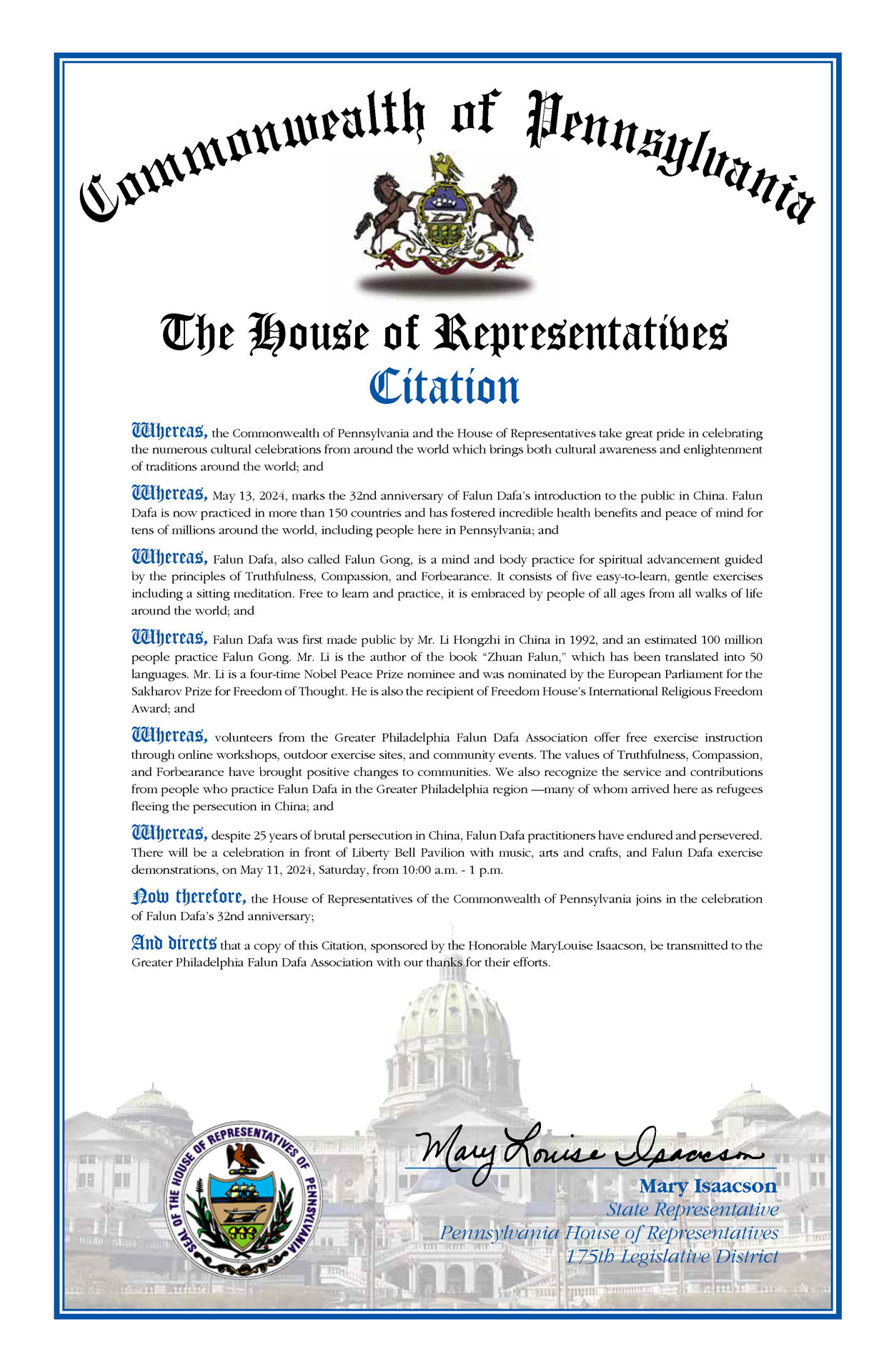 “Therefore, Senator Lindsey M. Williams, 38th district of Pennsylvania, recognizes World Falun Dafa Day on Saturday, May 13, 2024 and wishes happiness upon people celebrating 32 years of Falun Dafa in the world.”