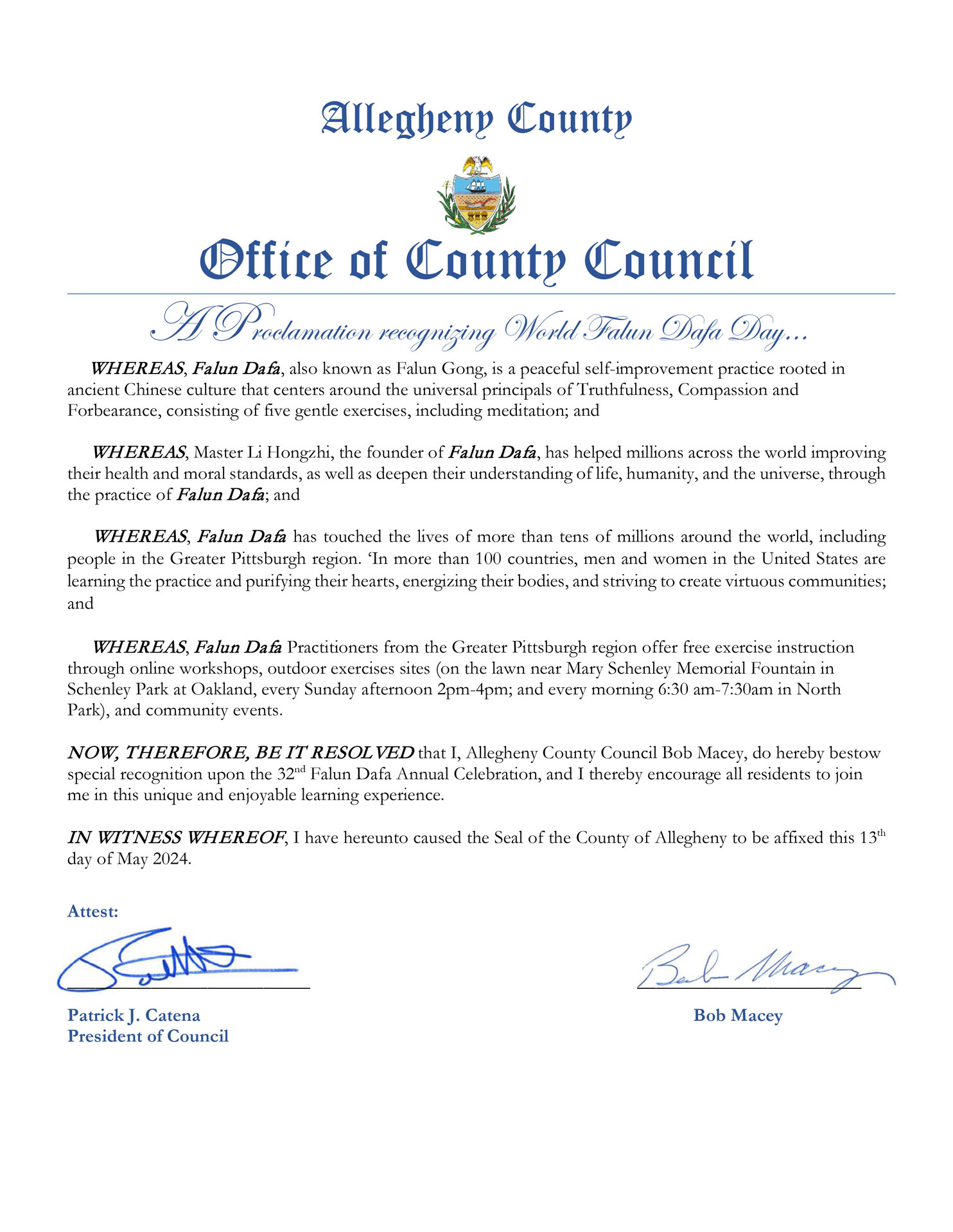 Proclamation from County Executive Patrick J. Catena and Council Member Bob Macey of Allegheny County