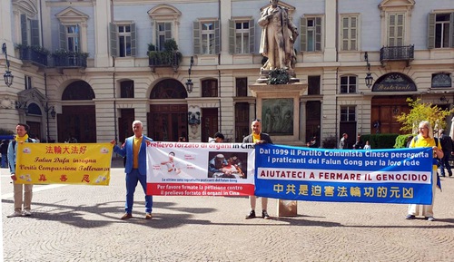 Known as the Heart of Turin, Piazza Carignano is a main plaza in the city and many people stopped to read the information about Falun Dafa. Some of them signed petitions calling to stop the brutality in China. One of them thanked practitioners for their efforts. Another one said, “The world needs a conscience and we must end this nightmare.”