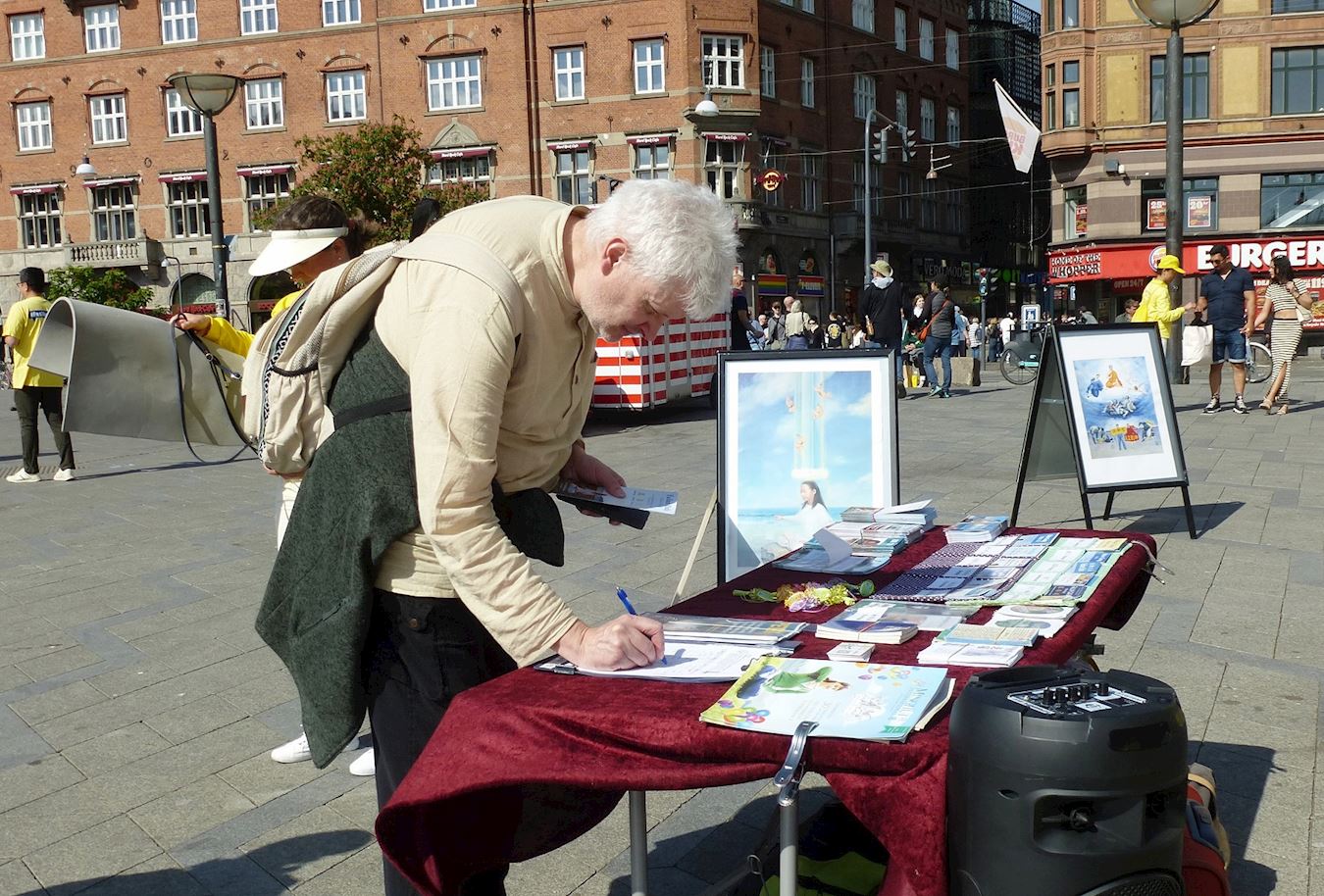 A young man from Gothenburg came to Copenhagen for the weekend. He walked to the event site, and after listening to the practitioners tell him the facts about Falun Dafa, he asked if practicing Falun Dafa can improve a person’s physical condition. Because of the side effects of a vaccine as a child, he could not sleep well. He could not concentrate on work and studies, and could not concentrate, which caused tension and anxiety. A practitioner told him that after cultivation, people can purify their minds, improve their physical condition, relieve tension and anxiety, and become calm and happy. He expressed great interest.