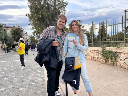 Christina and Dimitris accepted a flier from a practitioner and wished the practitioner good luck.