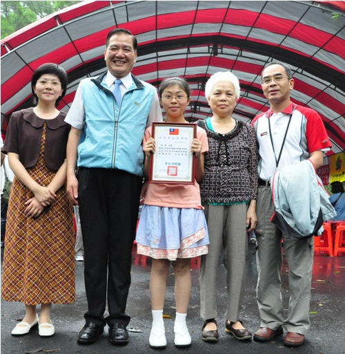 Wengting (third from left), her parents, and grandmother attend an award ceremony hosted by Hsu Ming-tsai, former mayor of Hsinchu.