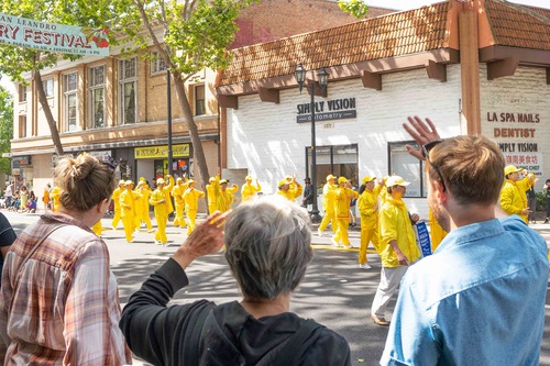 (Minghui.org) Practitioners’ exercise demonstration and waist drum teams from the San Francisco Bay Area participated in the parade. They demonstrated the exercises and many spectators welcomed them. Multiple people said that watching the exercise demonstration made them feel peaceful, tranquil, and relaxed. The waist drum team’s performance inspired the audience, especially when they noticed that many team members were elderly.