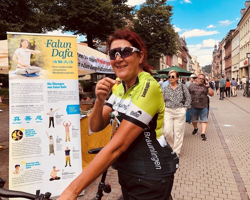 “This practice looks very peaceful and gentle. I want to try it too,” Keller said. She wrote down the location and time of the exercise sites in Heidelberg and Manheim, and said that she would go and personally experience Falun Gong.