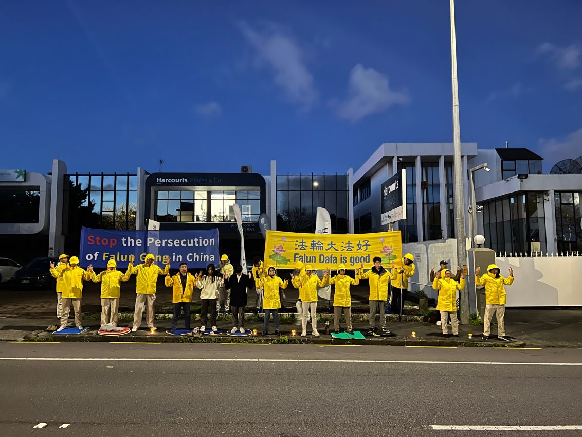 That evening, practitioners held a candlelight vigil in front of the Chinese Embassy in Auckland to commemorate those practitioners who were persecuted to death for upholding their beliefs. They called on the people of New Zealand to help stop the CCP’s persecution. Drivers in passing vehicles honked their horns to show their support.