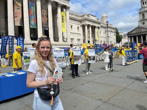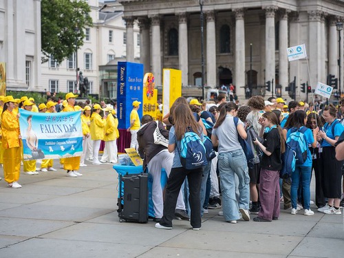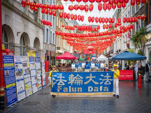 (Minghui.org) On the afternoon of July 20, 2024, practitioners held events in central London to expose the CCP’s (Chinese Communist Party) persecution of Falun Gong (Falun Dafa) that has gone on for 25 years. The Tian Guo Marching Band performed at the event and attracted many people, who stopped and watched.