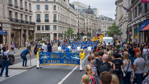 The march passed through central London’s busiest shopping street and Chinatown before reaching Trafalgar Square. Practitioners also held a press conference in front of the National Portrait Gallery to expose the CCP’s atrocities.