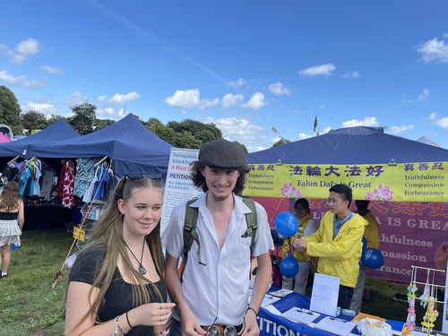 Edward came to the booth with his wife and daughter. He said that he lived in China for two and a half years and that the June Fourth protests and massacre [the CCP massacred students on Tiananmen Square on June 4, 1989] is a sad part of history. After listening to the practitioner describe the persecution, he thanked her and said he wanted to learn more about Falun Dafa. He said the values of Truthfulness, Compassion, and Forbearance were amazing and would benefit British society. The couple complimented the practitioners for what they were doing to help humanity.