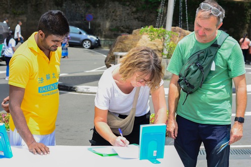 After learning about Falun Gong and the persecution, some people said they want to learn Falun Gong, and even purchased Falun Gong Dafa books while there. Some foreigners were also drawn to the exercise demonstrations by the practitioners and inquired about Falun Gong. Practitioners gave out the contact information of local practice sites to the interested passersby.