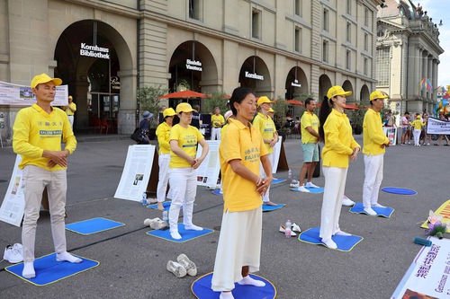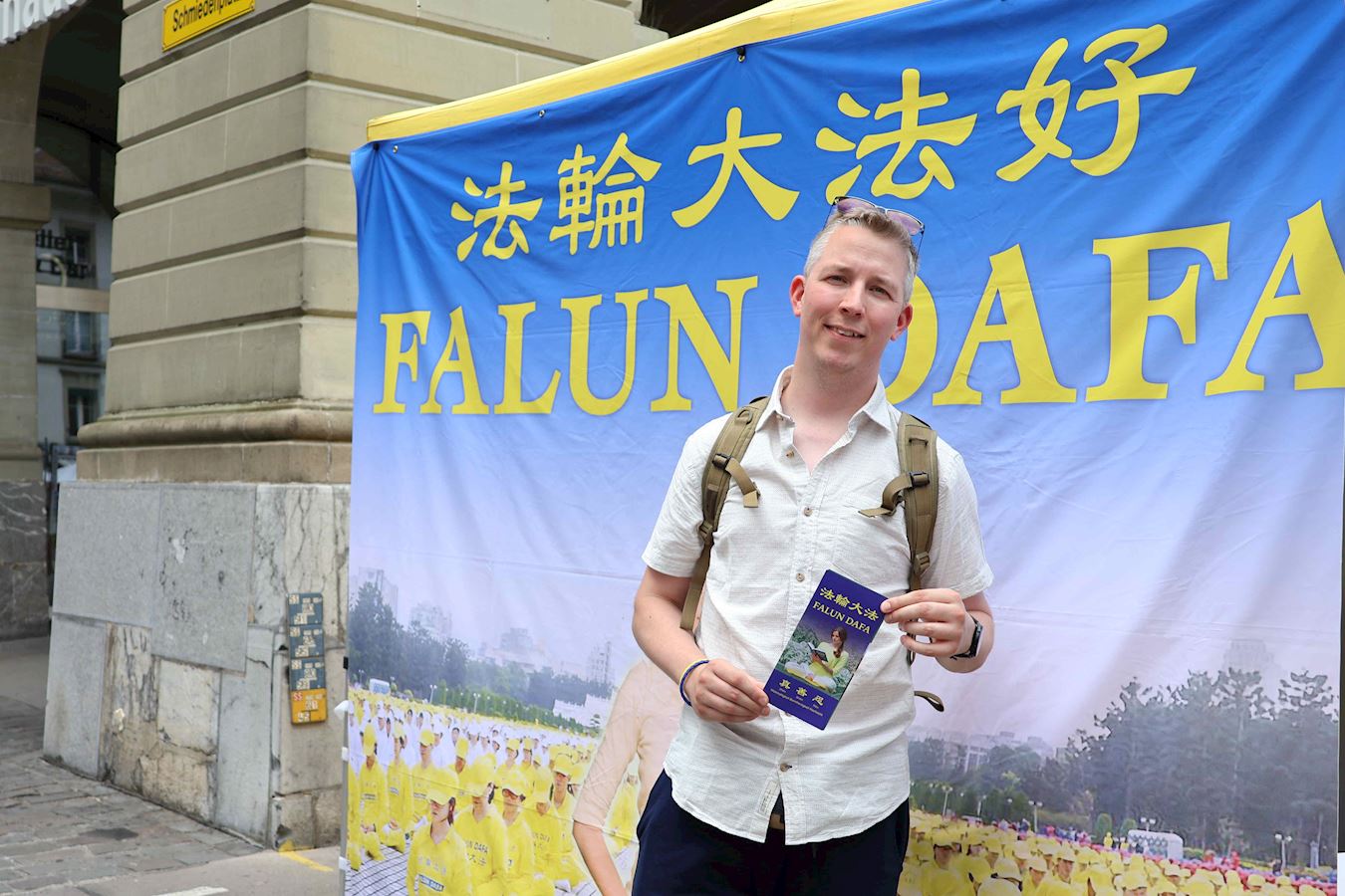 Alexander Lautenschläger, a military officer from Germany, was on holiday in Bern. He was delighted to see the Dafa practitioners’ activity. Several years ago, Mr. Lautenschläger learned about Falun Dafa online. He told practitioners, “I thought the message transmitted by this faith and the direction it provided is very attractive, it is so peaceful and amazing. I have a positive impression of Falun Gong. It mentioned particularly important points for humanity and society. I loved it.”