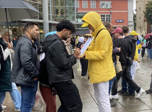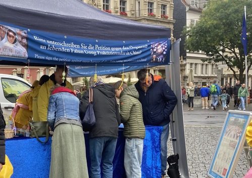 (Minghui.org) Falun Dafa practitioners from different parts of Germany held rallies in two locations in the center of Erfurt, a central city in eastern Germany on October 4, 2025. They introduced Falun Dafa and told people about the Chinese Communist Party’s (CCP) ongoing persecution of practitioners in China. The event gained the attention of the local residents, and many people signed the petition as a show of support for the practitioners’ efforts to end the persecution.