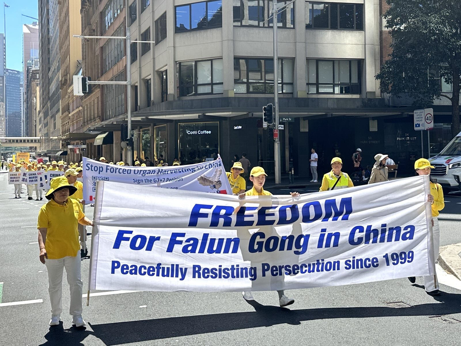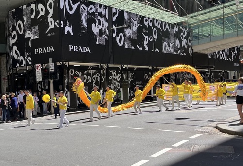 (Minghui.org) Practitioners held a march in the center of Sydney’s financial district on October 10, 2025, to introduce the principles of Truthfulness, Compassion, and Forbearance to the public. They also raised awareness of the Chinese Communist Party’s (CCP) 26-year-long persecution of Falun Dafa (also known as Falun Gong) in China.