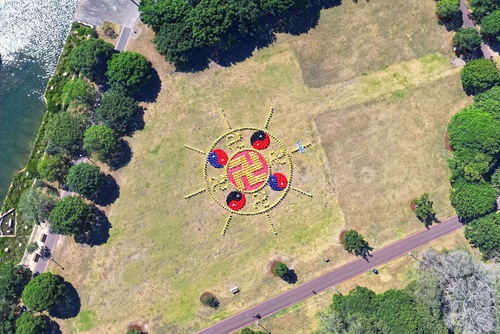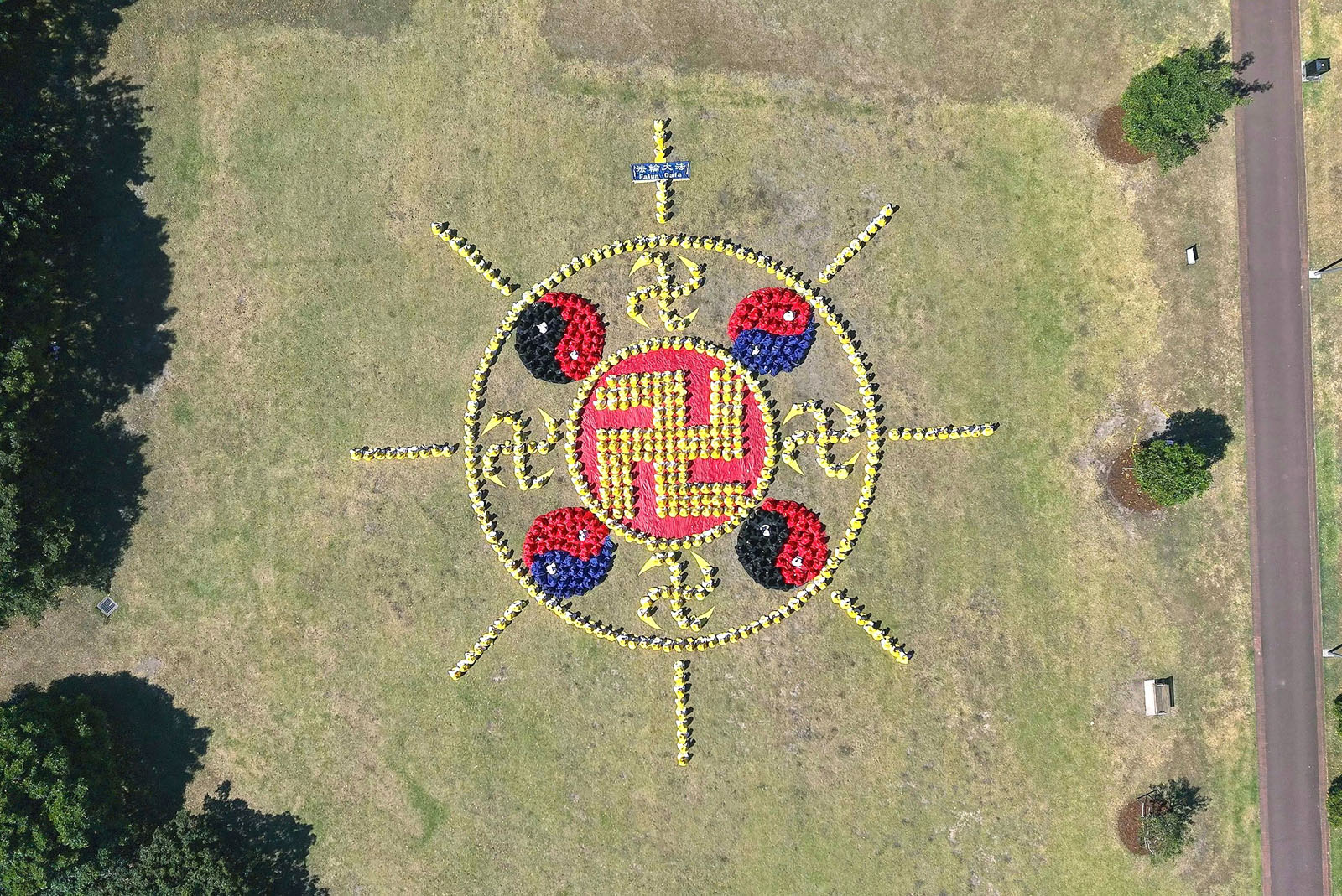 Practitioners formed an image of a Falun that was 24 meters in diameter. Adding in the outer rays, the diameter of the entire image was 37 meters. The Falun symbol is made up of a pair Taichi symbols that are red at the top and black at the bottom, another pair that are red at the top and blue at the bottom, as well as golden 卍 symbols. The symbol of Falun Dafa, the Falun emblem is a miniature of the universe.
