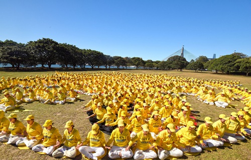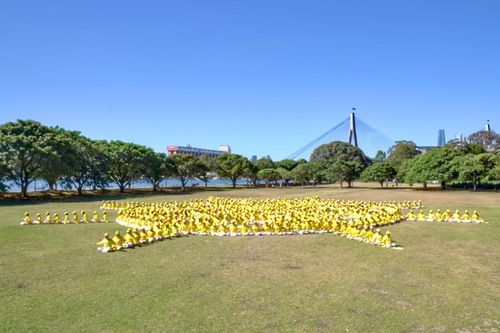 (Minghui.org) Falun Dafa practitioners from all parts of Australia gathered at Jubilee Park in Sydney on October 11, 2025, to form an image of a huge golden Falun and to do the exercises together. They wished to share the spirit of Truthfulness, Compassion, and Forbearance with Australia and the world, as well as their conviction in upholding freedom of belief.