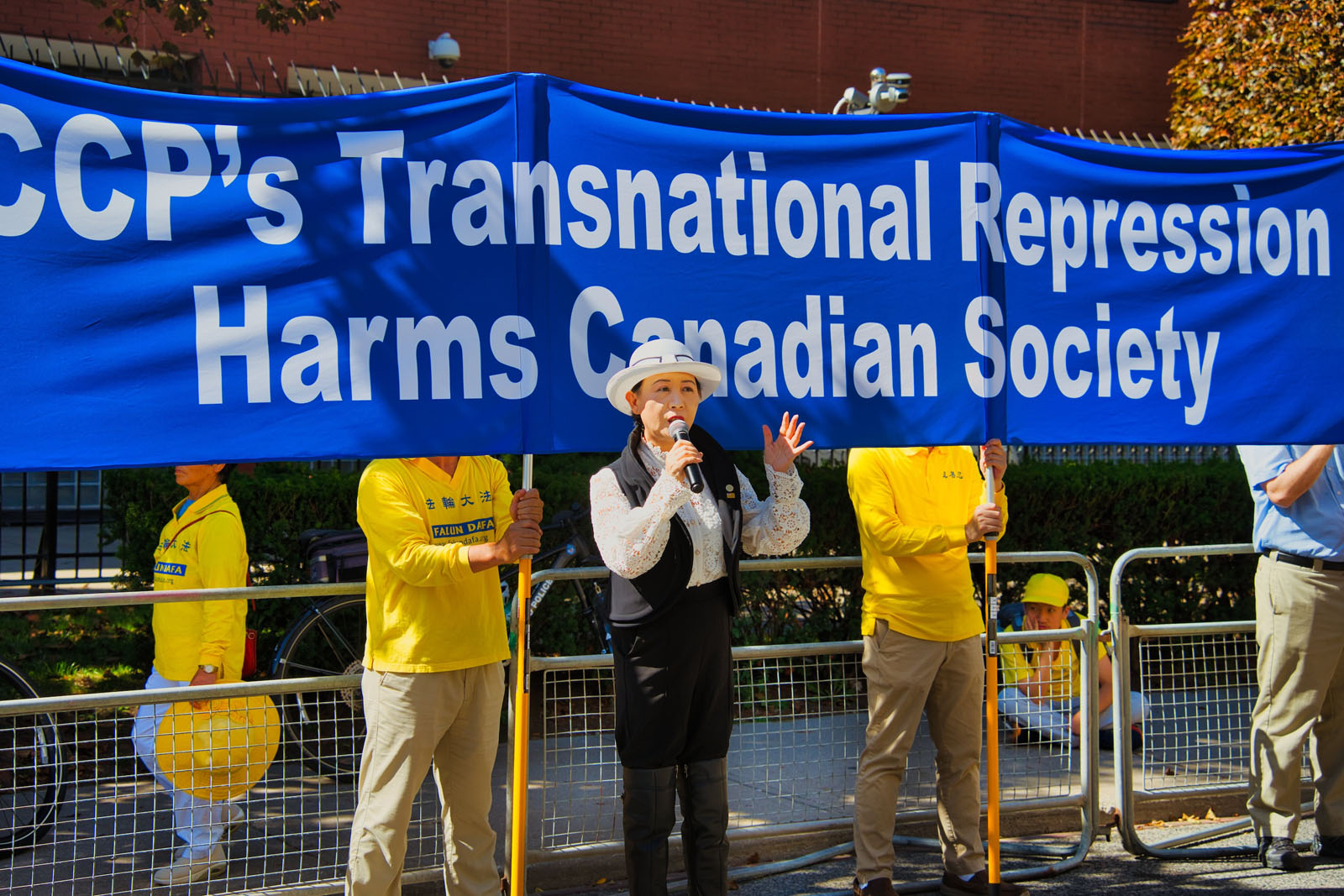 (Minghui.org) Falun Gong practitioners and democracy advocates held a rally in front of the Chinese Consulate in Toronto on September 28, 2025. They condemned the Chinese Communist Party’s (CCP) persecution of Falun Gong (also known as Falun Dafa) and called for help to stop the CCP’s transnational repression in Canada.