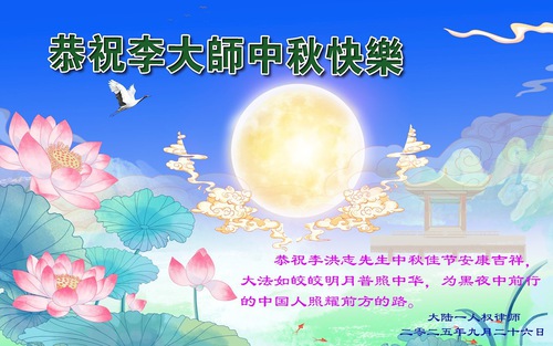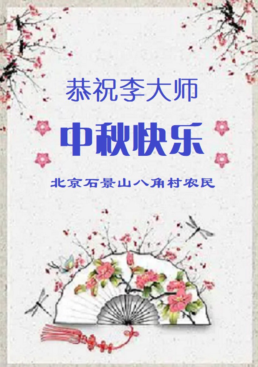 (Minghui.org) As the Mid-autumn Festival (also known as the Moon Festival) approaches, people throughout China are grateful for the immense physical and mental benefits they experienced after they began practicing Falun Dafa or said, “Falun Dafa is good.” They agree with Falun Dafa’s principles of Truthfulness-Compassion-Forbearance, wish for a better life, and hope the Chinese Communist Party’s (CCP) brutalities end soon. We present some of the greetings to Master Li, Falun Dafa’s founder, that were sent to the Minghui website.