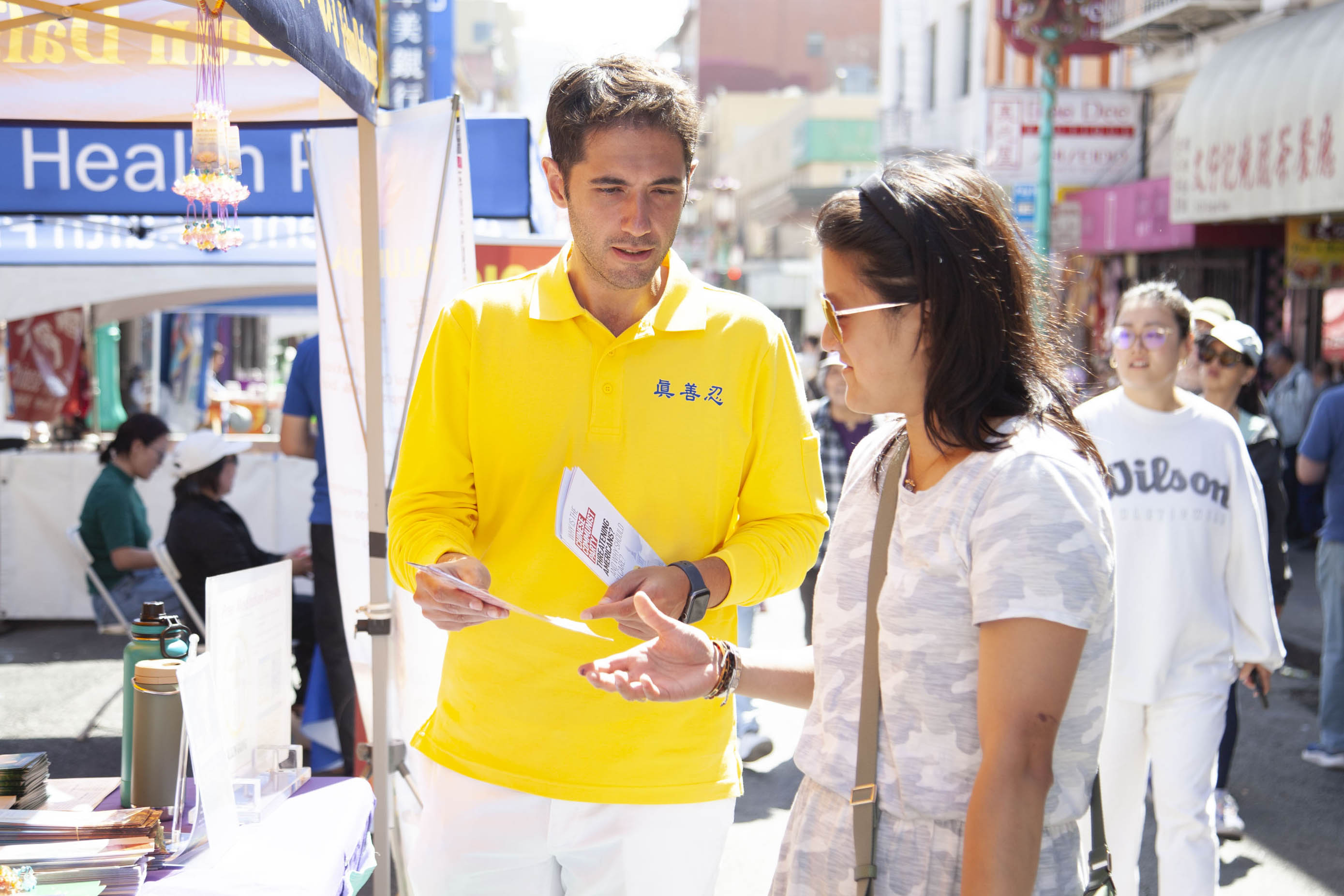 (Minghui.org) Falun Dafa practitioners participated in the Chinatown Autumn Moon Festival in San Francisco, held September 27-28, 2025. They introduced Falun Dafa (also known as Falun Gong) and raised awareness of the Chinese Communist Party’s (CCP) persecution. Many people signed the petition calling to stop the CCP’s state-sanctioned forced organ harvesting. Some people learned the Falun Dafa exercises during the event.