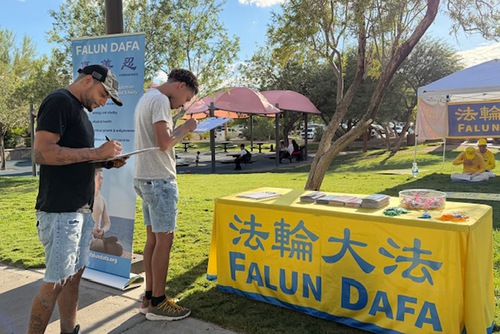 After chatting with a practitioner, they signed petitions to support practitioners’ efforts. They were interested in learning the exercises, so practitioners showed them how to do the third excise. They were very happy and Isaac said the practice made him feel energetic as well as relaxed. They continued talking with the practitioner for a long time before they left.