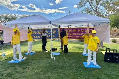 (Minghui.org) With the Mid-Autumn Festival around the corner, practitioners in Las Vegas gathered at Exploration Peak Park on September 28 to celebrate, introduce Falun Dafa (Falun Gong) to the local community, and thank Master Li (founder of the practice) for the benefits they received from the practice.