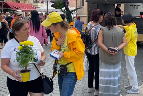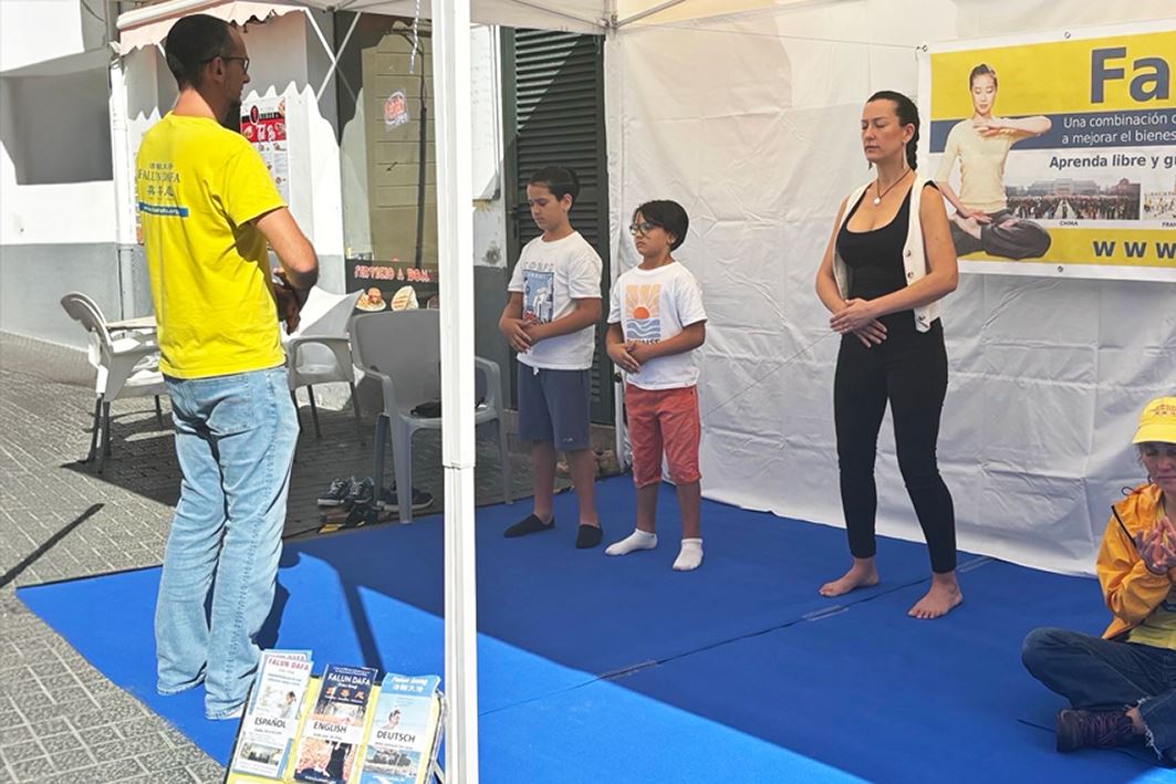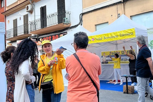 (Minghui.org) Practitioners introduced people to Falun Dafa in a market in Inca, a town on the Spanish island of Mallorca (Majorca), from October 18 to 19, 2025. Many residents and tourists learned the benefits of practicing Falun Dafa, and some started to learn the exercises. People bought copies of Falun Dafa’s main book Zhuan Falun and expressed interest in learning the exercises.