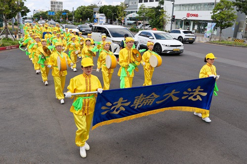 The event, hosted by the Falun Dafa Association of South Korea, was attended by practitioners from South Korea, Japan, Taiwan, Vietnam, and other countries. They did the exercises in Samda Park in Jeju City, followed by a stage performance and a parade along the main street lasting about 3 kilometers.