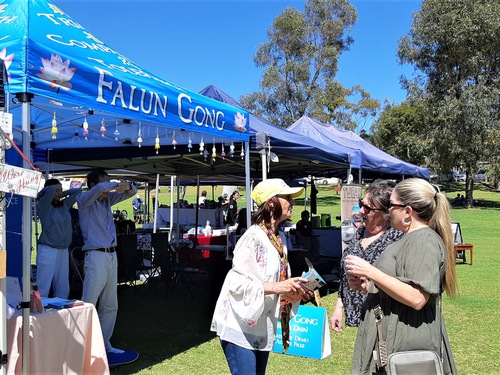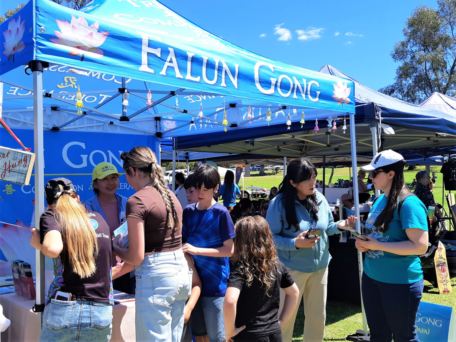 (Minghui.org) The annual Rotary Kwinana Community Fair was held in Calista, south of Perth, on November 8, 2025. There were over 100 booths. Falun Dafa practitioners set up a booth, which drew many visitors. Some people wished to learn the exercises right then.