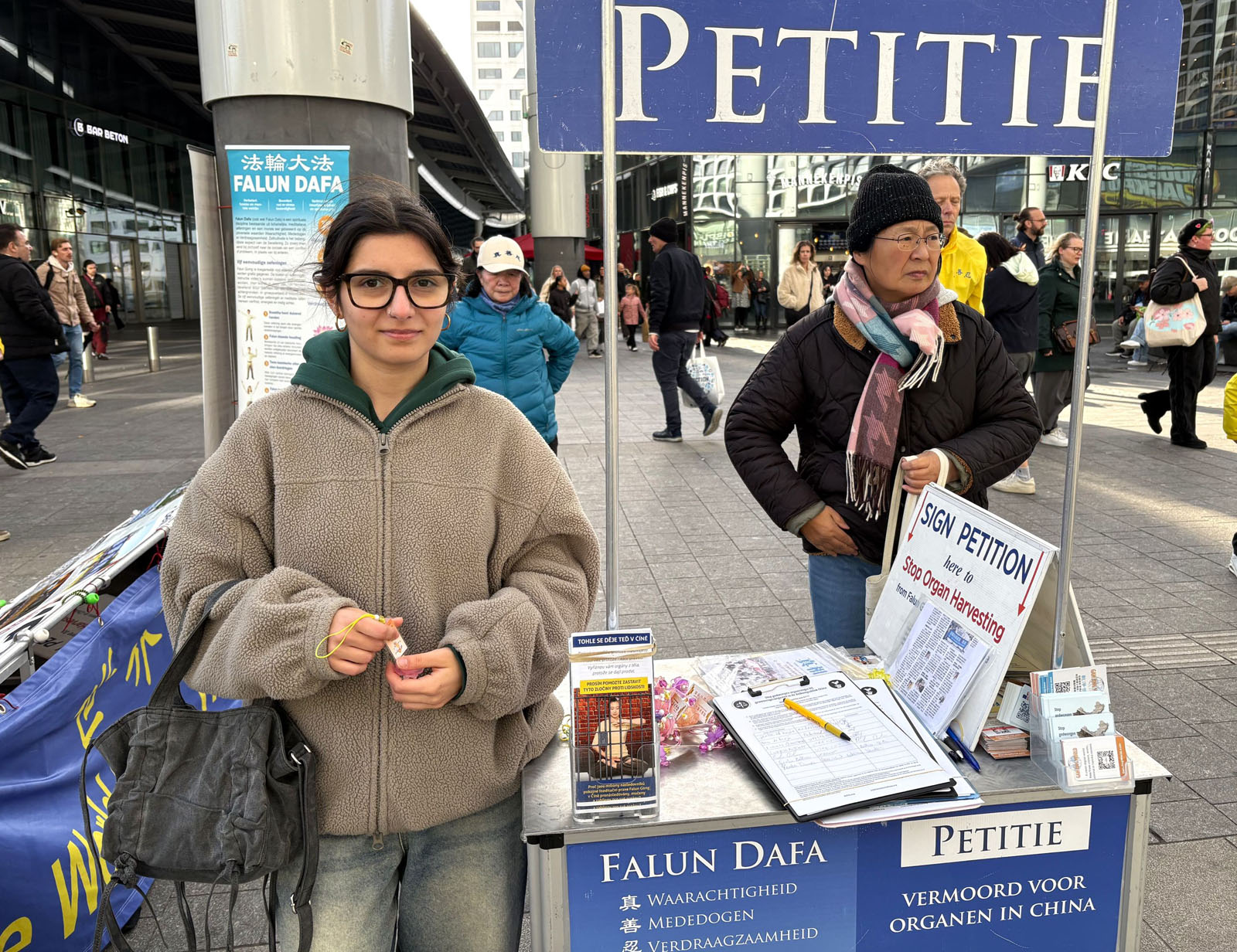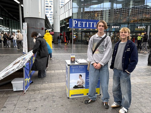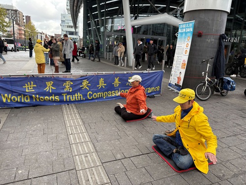 On October 26, 2025, Falun Dafa practitioners held an activity near the Utrecht Central Station to introduce Falun Dafa and raise awareness of the forced organ harvesting in China.