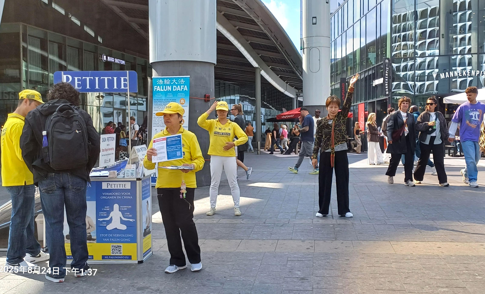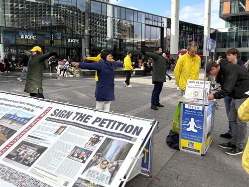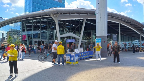(Minghui.org) On October 26, 2025, Falun Dafa practitioners from different cities in the Netherlands held an activity near the Utrecht Central Station to tell the public about Falun Dafa and the forced organ harvesting of its practitioners in China. They set up an information booth with materials displaying the facts of the Chinese Communist Party’s (CCP) persecution. They did the Falun Dafa exercises, and collected signatures on a petition that calls on the G7+7 nations to take action to stop the CCP’s forced organ harvesting operations.