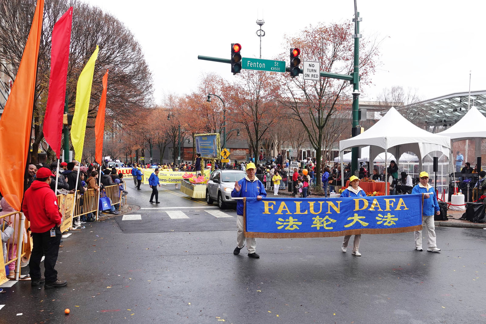 Falun Dafa practitioners participate in the Thanksgiving Parade.