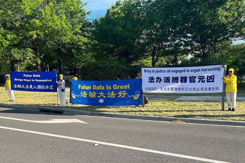 Zhao’s motorcade passed by the practitioners’ protest sites twice and saw the banners and heard the practitioners’ shouting, “Falun Dafa is good,” and “Stop persecuting Falun Gong.”