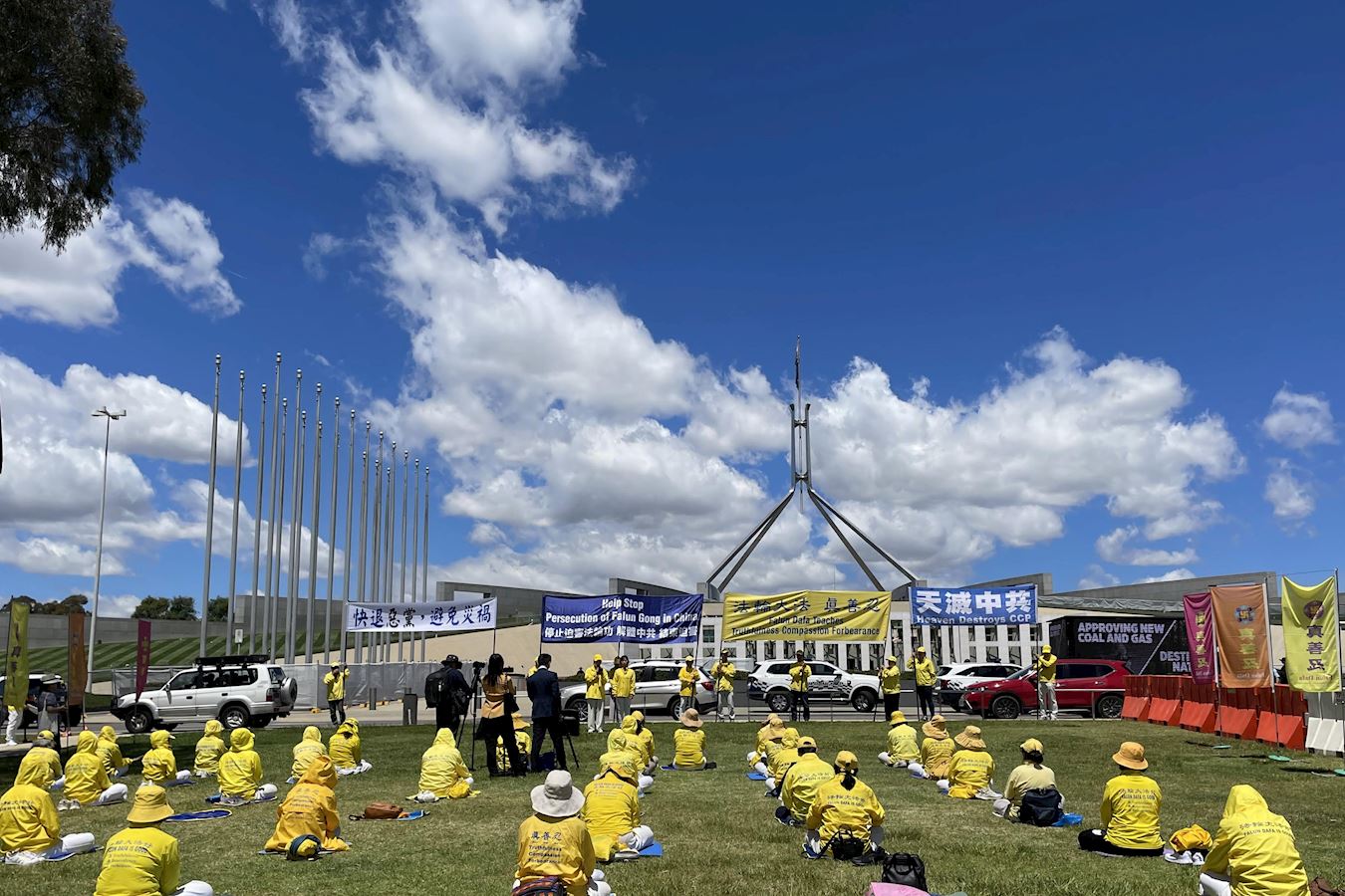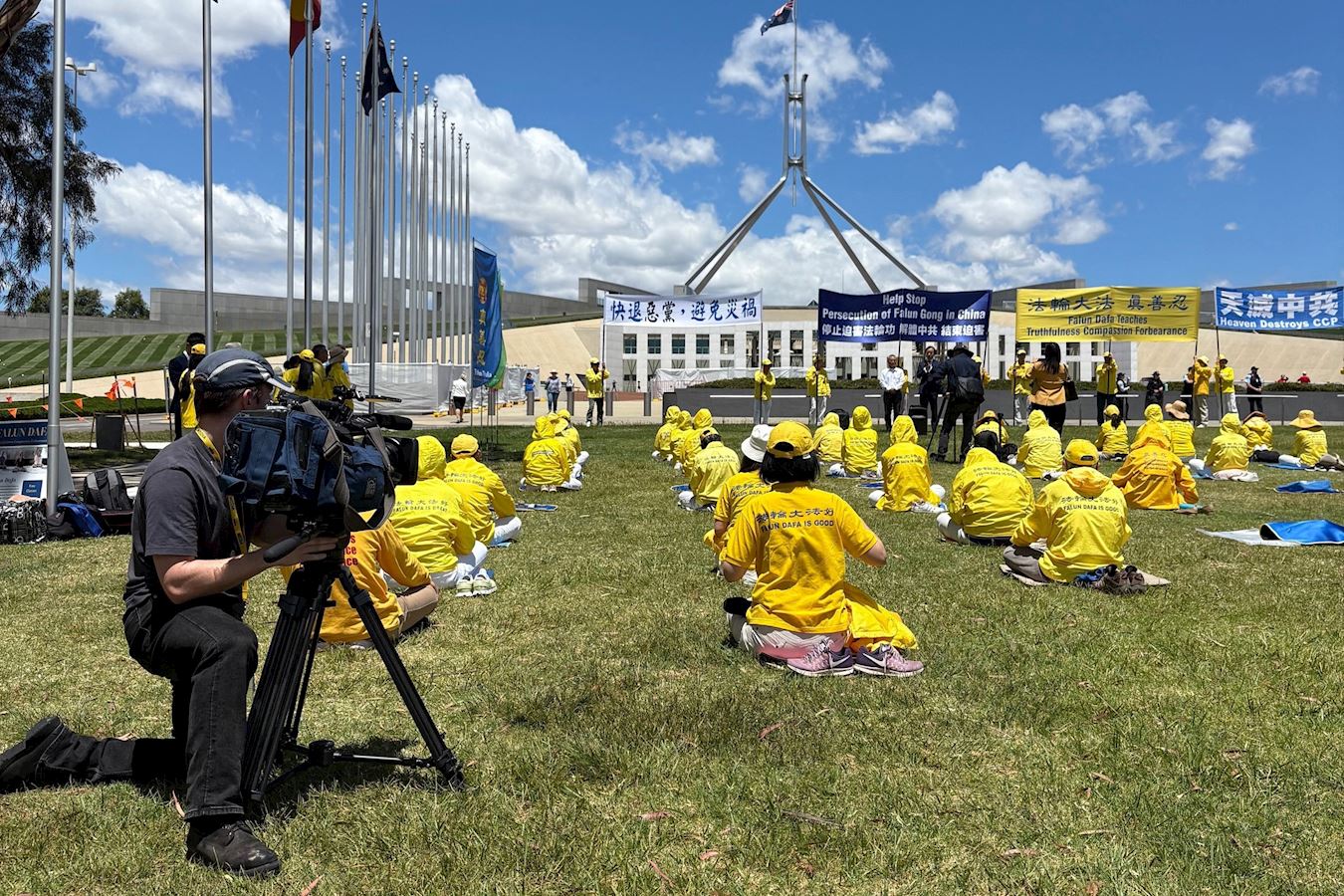 Falun Dafa practitioners held a rally in front of Parliament House in Canberra on November 24, 2025 to protest Zhao Leji’s visit.