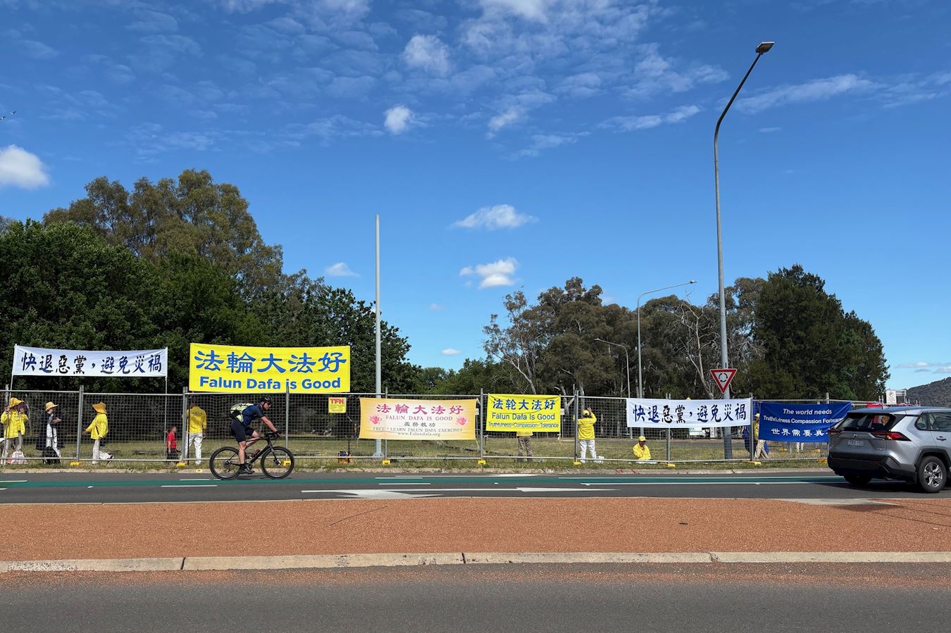 Practitioners held banners beside roads near the Chinese Embassy on November 25, 2025.