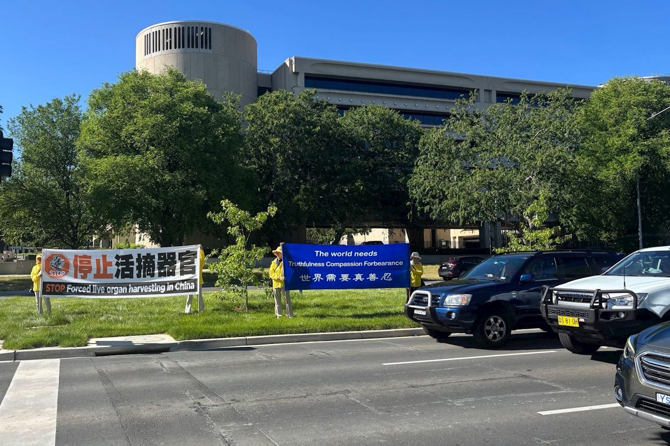 (Minghui.org) Falun Dafa practitioners held a rally in front of Parliament House in Canberra on November 24, 2025 to protest Zhao Leji’s visit, the third most powerful CCP official. He plays an important role in the Chinese Communist Party’s (CCP) persecution of Falun Dafa (also known as Falun Gong) and the state-sanctioned forced organ harvesting. The practitioners called on the Australian government to sanction him.