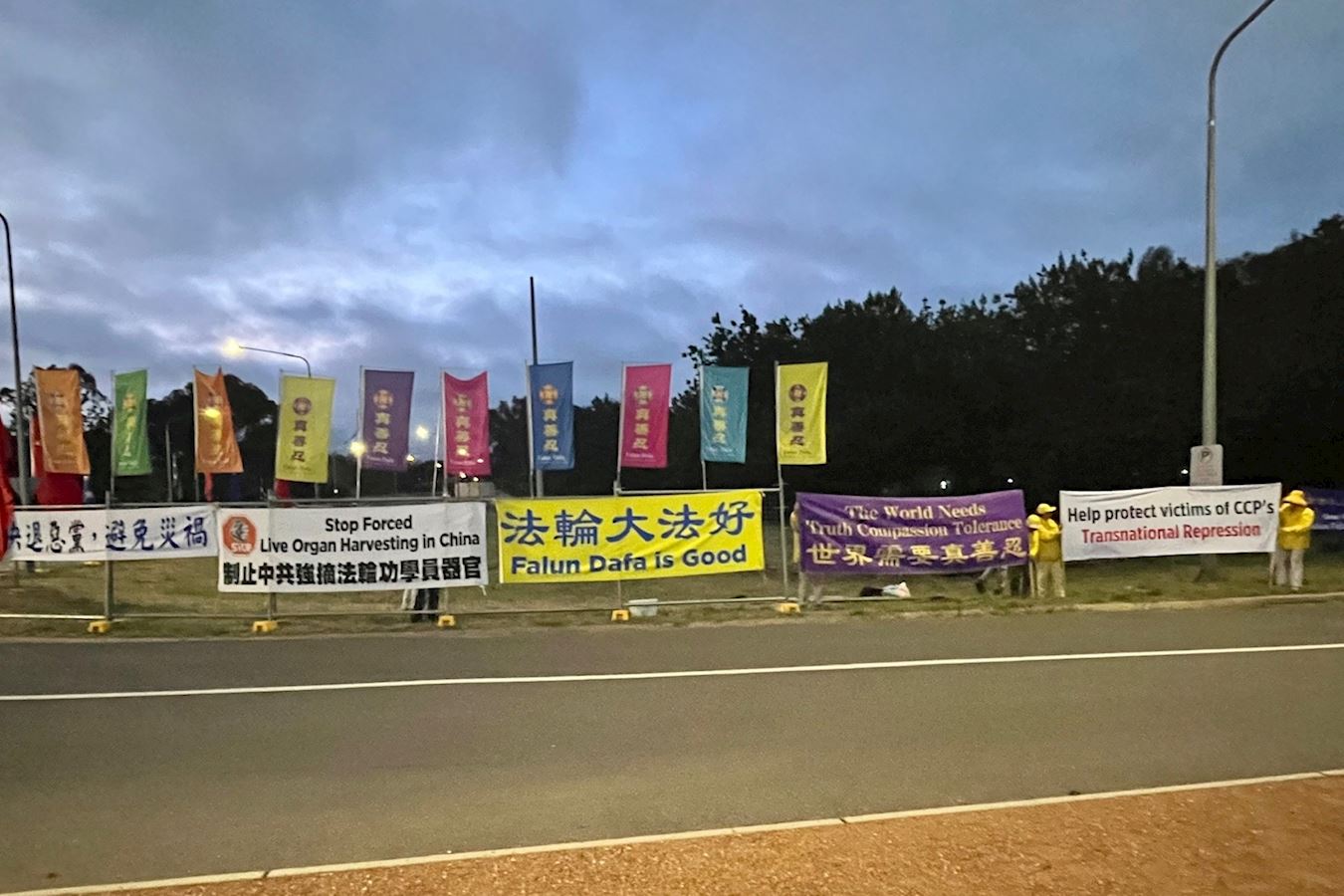 Practitioners protest the CCP’s persecution and transnational repression in front of the Chinese Embassy, near the airport, and the roads that the CCP’s motorcade pass by on November 24 and 25