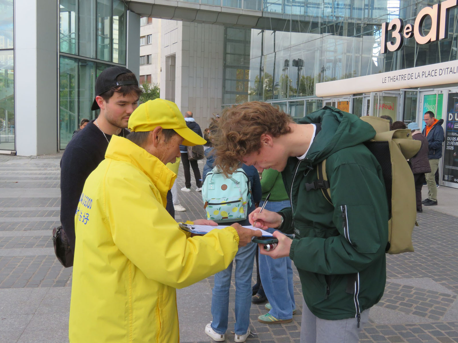 Located in the 13th Arrondissement of Paris, Place d’Italie is located in a large commercial center, with the arrondissement government building located on the other side of the square. Practitioners set up a booth facing the commercial center on Saturday, October 25. People watching practitioners demonstrate the five sets of Falun Gong exercises learned that the Chinese Communist Party (CCP) persecutes those who follow Truthfulness, Compassion, and Forbearance in China. They were also informed about the CCP’s state-sanctioned forced organ harvesting of prisoners of conscience. Stunned and indignant over the atrocities, many people signed the petition calling for an end to the persecution.