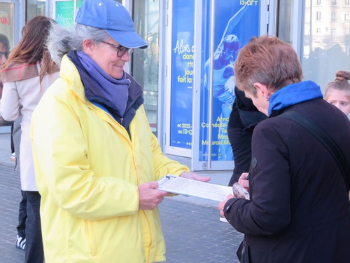 Social worker Nathalie passed by the practitioners’ event and was dismayed to hear about the CCP’s persecution of Falun Gong and the forced organ harvesting. She said, “This arbitrary harvesting of human organs is absolutely insane! The victims will die because of it.” She said that she would share this information and videos on her webpage to support Falun Gong as much as possible. Before leaving, she said to the practitioners, “Thank you for coming here and having the courage to let the truth be known. Good luck to you!”