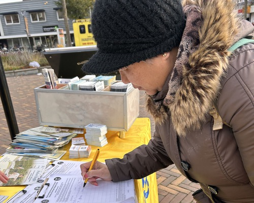 A practitioner thanked her and said there was no need to sign it again, but the woman insisted on signing it on behalf of her daughter. She said, “The crime [forced organ harvesting] must be stopped. It’s so evil!”