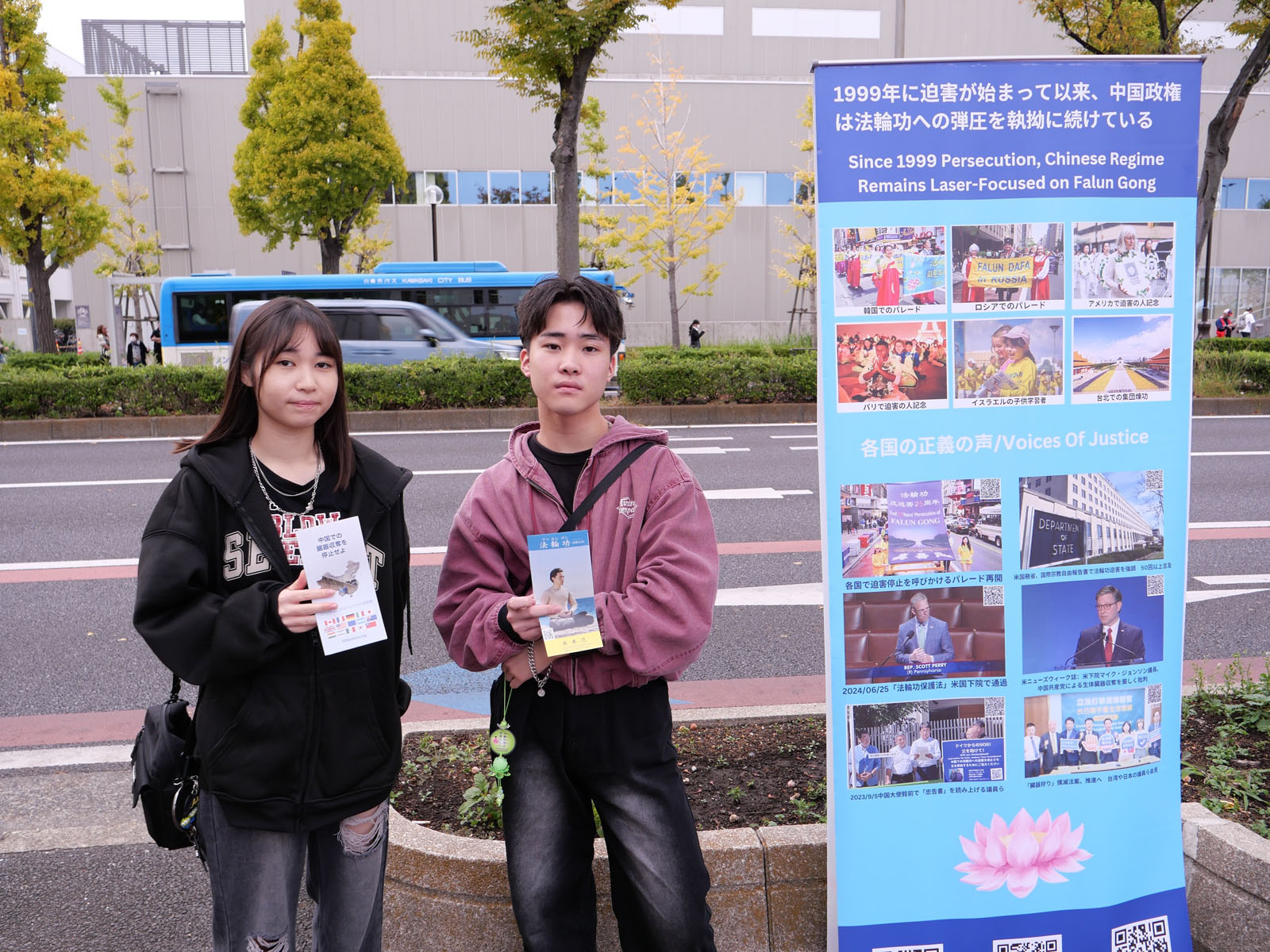 The Kawasaki Citizens’ Festival is a major event in Kawasaki City, Kanagawa Prefecture, lasting three days and attracting nearly 500,000 visitors. Falun Gong practitioners displayed banners and posters near the event venue with messages such as “Falun Dafa Is Good,” “The Truth About the CCP’s Forced Organ Harvesting,” and distributed informational materials at major intersections.