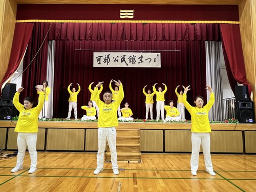 Falun Gong practitioners in Hiroshima participated in the 52nd Hiroshima City Kōbe Community Center Festival on November 2, 2025. They introduced Falun Gong on stage and demonstrated the five sets of exercises. Almost all the audience members followed along, creating a peaceful atmosphere. After the event, many people asked about local practice sites, and some offered to help practitioners.