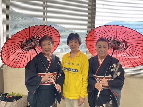 After talking to practitioners and learning about Falun Gong, Ms. Yasuda, the instructor of the “Kimono Beauty” group, said she agreed with the principles of Truthfulness, Compassion, and Forbearance. She said when she had a day off, she would go to the teaching classroom at the Kobu Community Center to learn the exercises and exchange contact information with the practitioners.