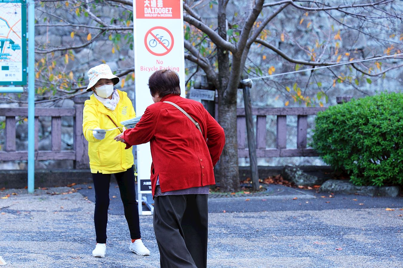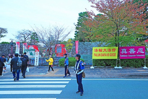 Distributing information about Falun Dafa near Sumpu Castle Park, the main venue of the Daidogei World Cup.