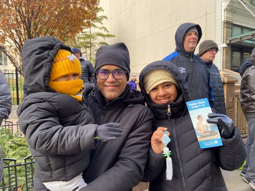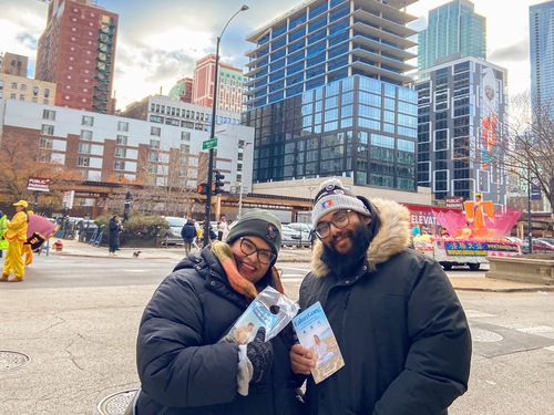 Chicago residents Gomez and his wife Gaby said they were happy to learn about Falun Dafa. Gaby said, “I’d like to learn more about this practice.” She was happy to see the Falun Dafa float. She said, “The float is gorgeous! I’m happy to see you here.”