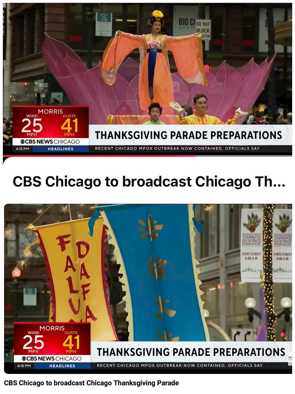 The parade was broadcast live on CBS Chicago, simultaneously aired on Pluto TV, and rebroadcast on canTV, greatly expanding the number of parade viewers. CBS Chicago, as the host of the live broadcast, used clips of the Falun Dafa entry from the 2024 parade in its 34-second trailer.