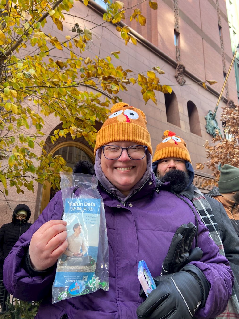 She said that Thanksgiving is a holiday that causes her to reflect and appreciate Falun Dafa all the more. Her parents and children have all benefited from practicing Dafa. “I’m truly grateful to practice cultivation,” she said. “I hope people can feel the positive energy and warmth from Falun Dafa on the cold holiday via this parade.”