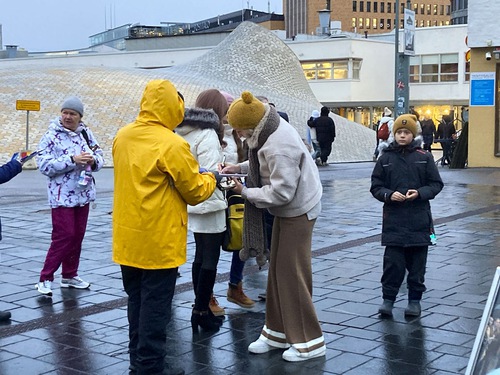 Portraits of practitioners who died as a result of the CCP’s persecution were displayed on the square. Some are relatives of practitioners in Finland. Lighted candles were placed before the portraits, and practitioners silently remembered their fellow practitioners who were persecuted to death. Many passersby were moved and paused to learn about the event and sign the petition. It rained two hours later. Some practitioners continued sitting in the rain, winning people’s empathy and respect.