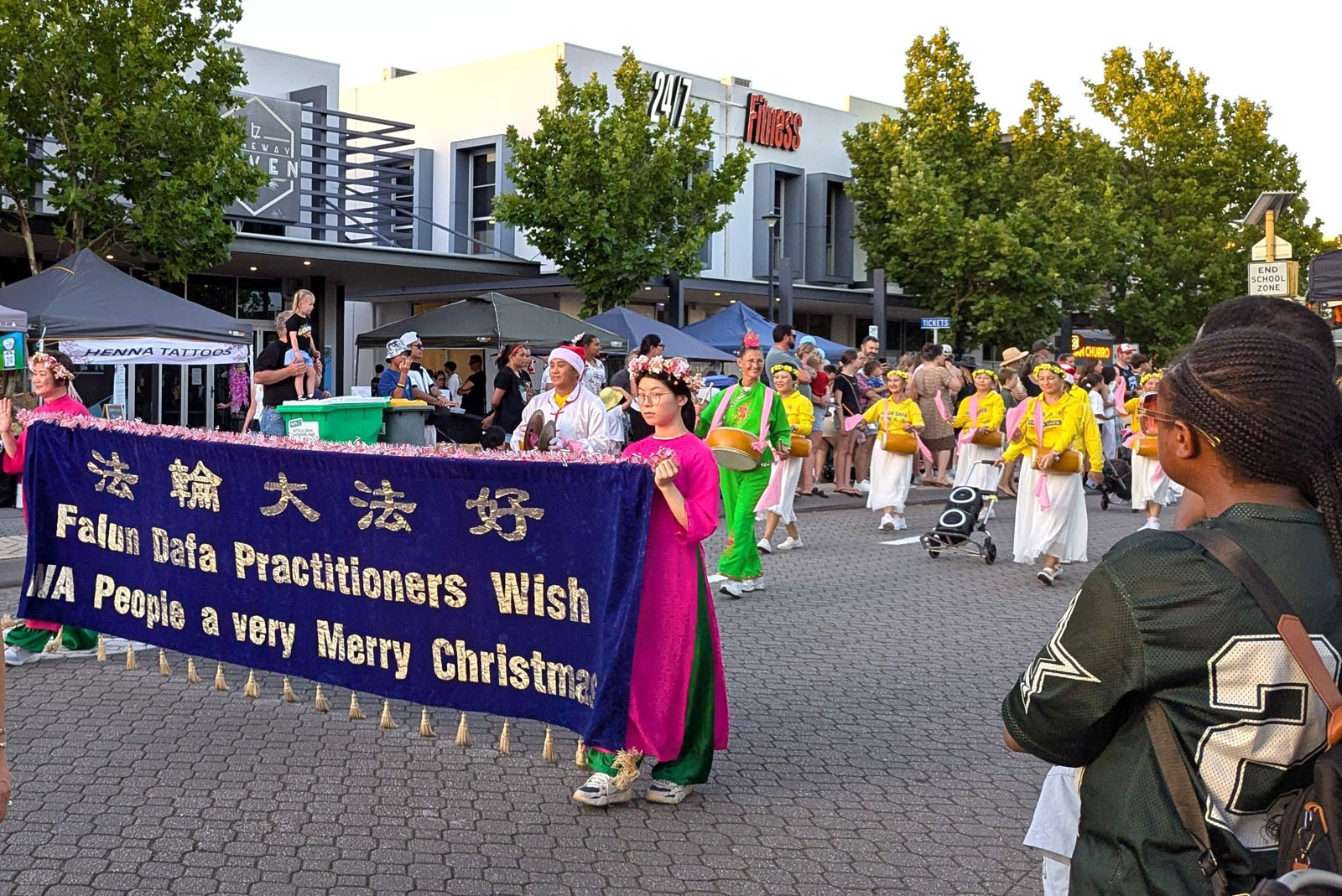 Many people praised the practitioners’ entry during the Bunbury City Christmas Parade, which was held on the evening of December 14. Their group included celestial fairies, a waist drum team, a flag team, and a Chinese dragon dance. The dazzling colors, along with the inspiring drum beats with the lively golden Chinese dragon, created a festive and auspicious atmosphere. The Chinese dragon and fairies interacted with the spectators who cheered and applauded them.