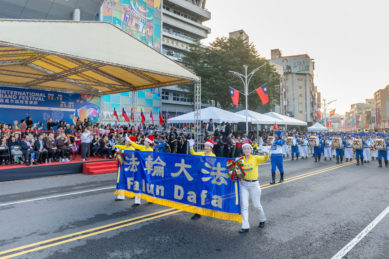 (Minghui.org) The Tian Guo Marching Band made another memorable appearance at the 33rd Chiayi City International Band Festival on Saturday, December 20, 2025. The band has participated in the event for more than a decade. This year, the Tian Guo Marching Band was made up of more than 200 Falun Dafa practitioners from all parts of Taiwan, and they were once again a highlight of the festival.