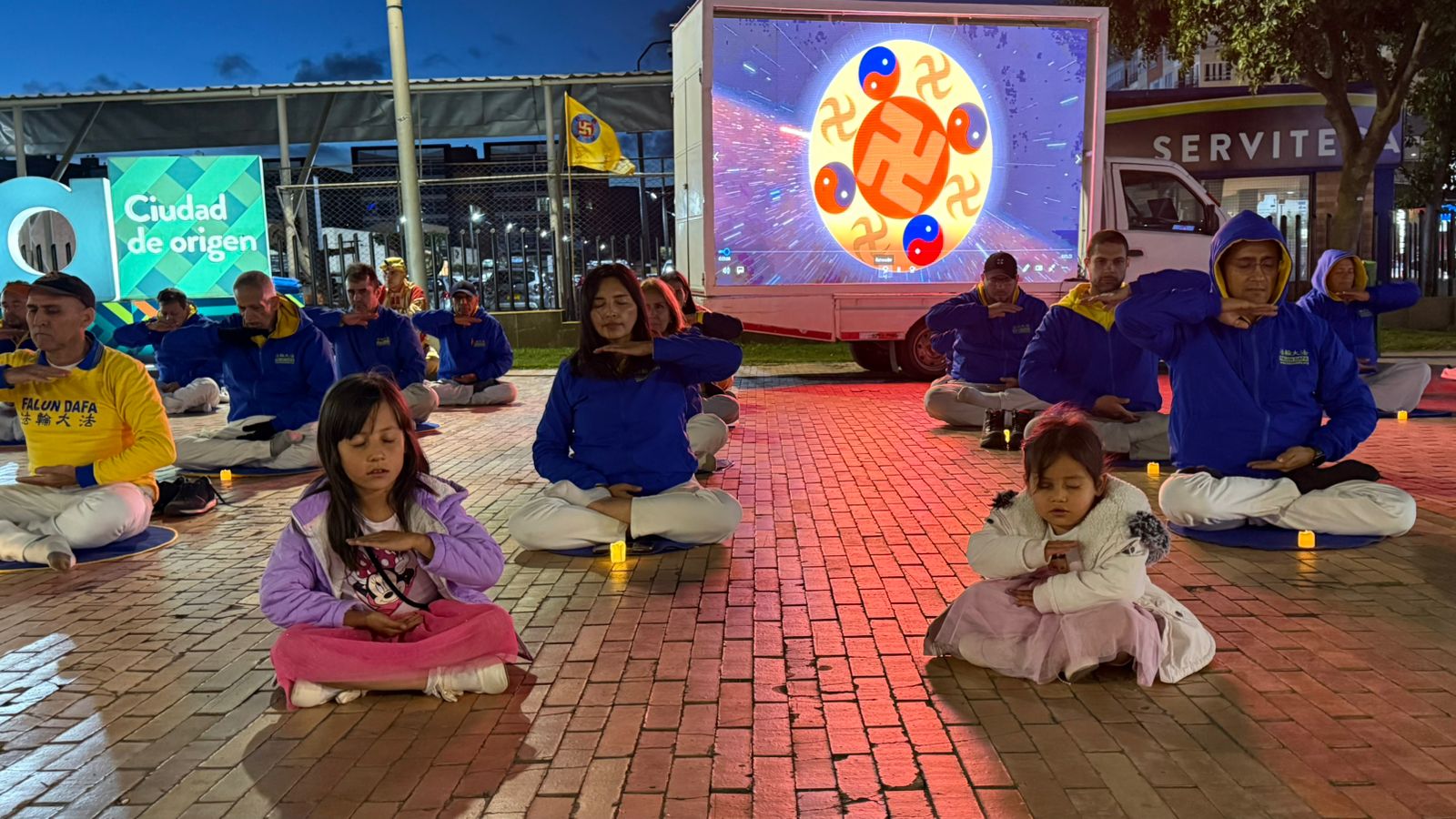 Practitioners demonstrate the Falun Gong exercises in front of the Unicentro shopping mall in the city of Tunja.