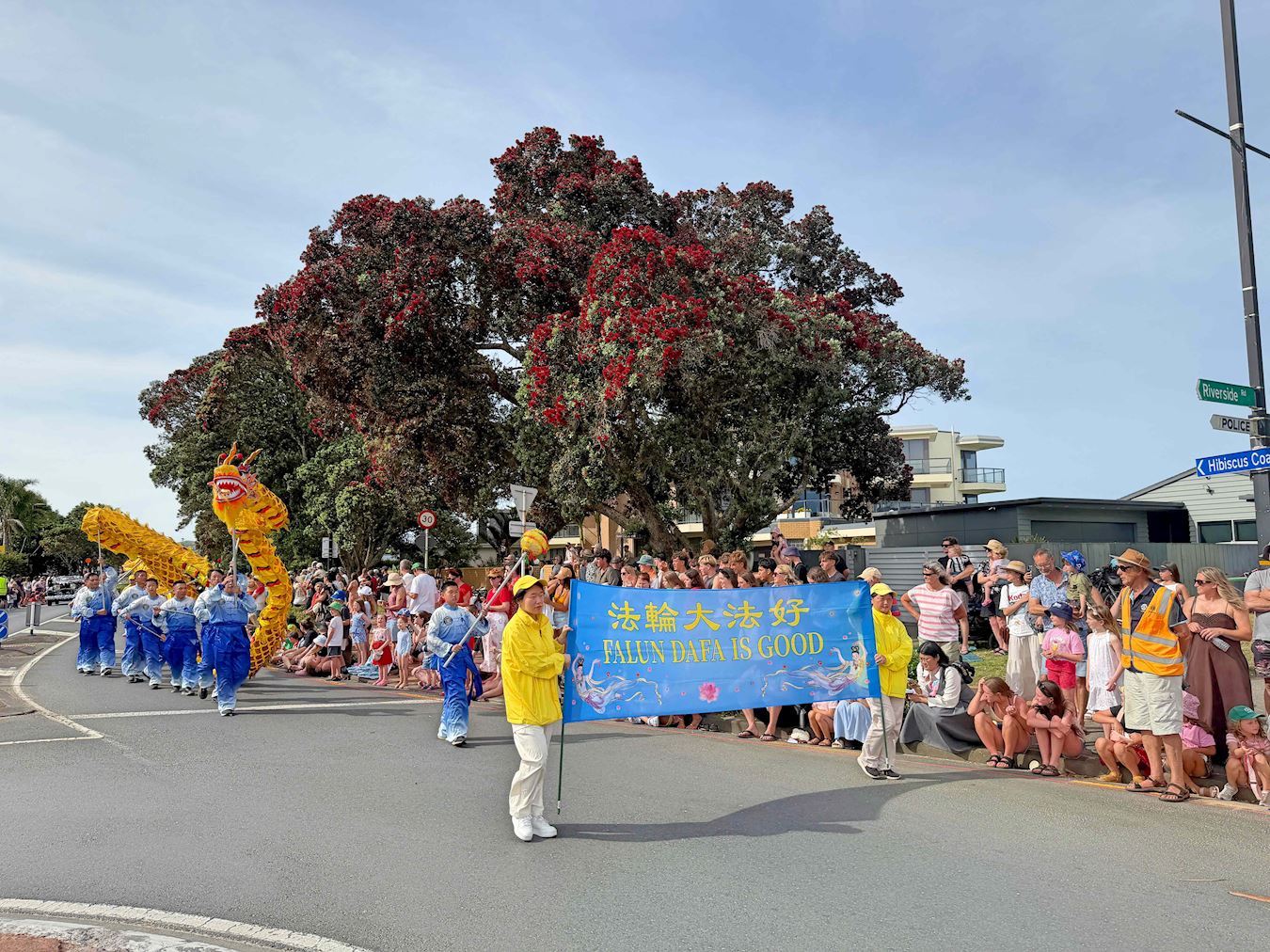 The Tian Guo Marching Band composed of Falun Dafa practitioners from New Zealand and Australia were greeted with warm applause. People took photos, complimented the band on their blue and white outfits, and said the band’s music blended perfectly with the event’s festive atmosphere. Eye-catching “Truthfulness-Compassion-Forbearance” banners decorated the float, which was followed by the dragon dance team, something the children really enjoyed.